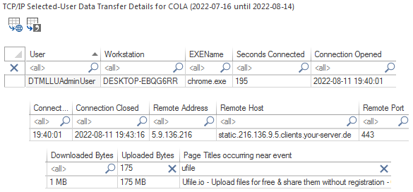 The following image shows activity details of a specific user's upload connection.